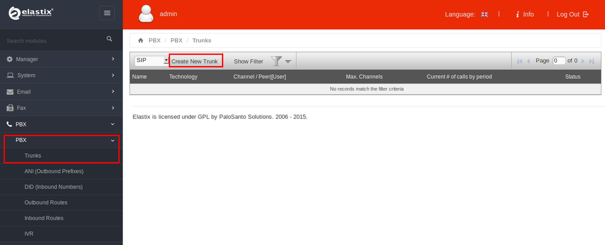 Öffnen Sie in der linken Menüleiste „PBX → Trunk“ und klicken Sie auf „Create New Trunk“.