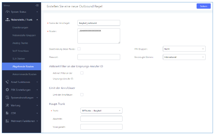 Trunk: Wählen Sie den easybell SIP Trunk, den Sie gerade erstellt haben.