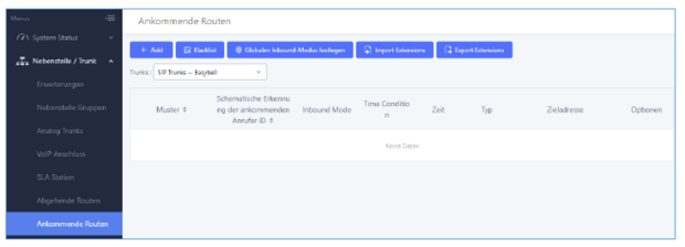 Klicken Sie links im Menü auf „Nebenstelle / Trunk“ und wählen Sie „Ankommende Routen“. Bitte klicken Sie dann auf den Button „+ Add“, um einen SIP Trunk hinzuzufügen.