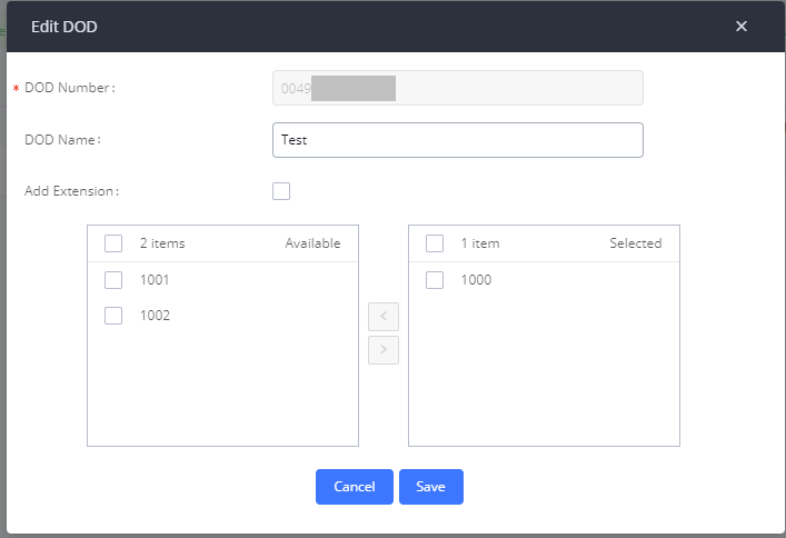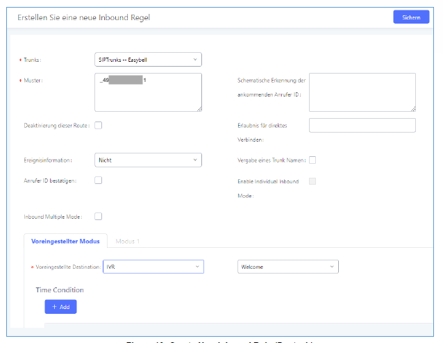 DID Muster: Dies ist die DID, die ein Anrufer gewählt hat um Ihr UCM zu erreichen. Dies sollte entsprechend dem von easybell für Ihren Trunk bereitgestellten DID eingestellt werden. In diesem Beispiel ist es _49...1. Der Unterstrich wird für das DID-Muster benötigt und es ist die vollständige Rufnummer inklusive der Durchwahl einzutragen (in diesem Beispiel „1“ am Ende der Nummer).
