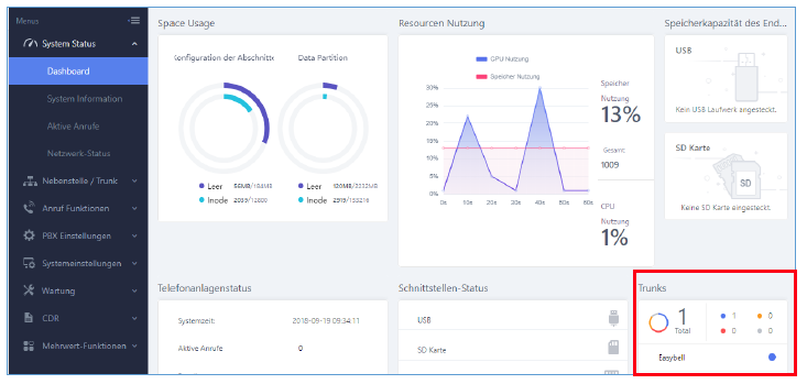 Nachdem Sie die Änderungen vorgenommen haben, können Sie überprüfen ob sich der SIP Trunk erfolgreich registriert hat. Klicken Sie dafür auf „System Status“ und „Dashboard“. Wenn der Punkt neben dem Wort „Easybell“ blau ist, hat sich der SIP Trunk erfolgreich registrieen können.