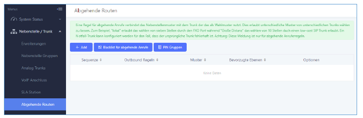 Klicken Sie links im Menü auf „Nebenstelle / Trunk“ und wählen Sie „Abgehende Routen“. Klicken Sie dann bitte auf den Button „+ Add“, um einen SIP-Trunk hinzuzufügen.