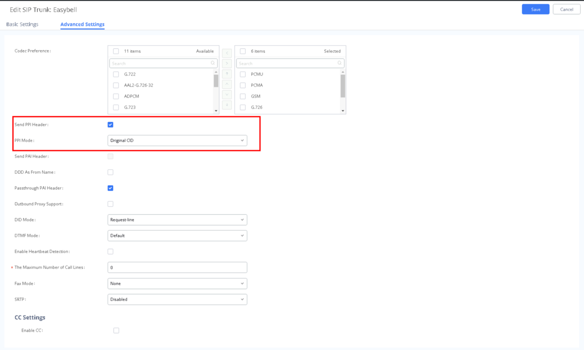 Wechseln Sie nun zu den erweiterten Einstellungen. Dort ist die Option „Send PPI Header“ zu aktivieren und unter „PPI Mode“ ist „Original CID“ auszuwählen. So schickt die UCM IP PBX im SIP-Header P-Preferred-Identity (PPI) wie oben definiert die Anruferkennung des Anrufenden mit. Dies gilt sowohl bei ausgehenden Anrufen, als auch bei Weiterleitungen.