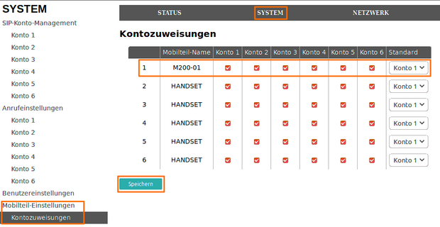 Nachdem alle Handteile angemeldet sind, können diese in der Weboberfläche der Basis unter dem Punkt „System“ → „Mobilteil-Einstellungen“ → „Kontozuweisung“ dem jeweiligen Konto zugeordnet werden.