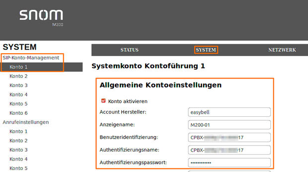 Öffnen Sie nun unter „SYSTEM“ die Einstellungen von „Konto 1“. Hier tragen Sie nun bitte die SIP-Zugangsdaten aus dem jeweiligen Endgerätekonto der easybell Cloud Telefonanlage ein.