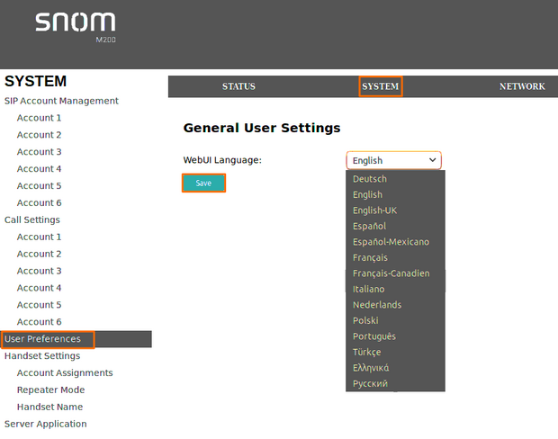 Navigieren Sie nun in den Reiter „System“ und den Navigationspunkt „User Preferences“. Hier kann die Systemsprache eingestellt werden. Mit „Save“ speichern Sie die Einstellungen.
