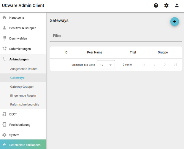 Loggen Sie sich in die UCware Administrationsoberfläche ein und navigieren Sie zu AnbindungenGateways.