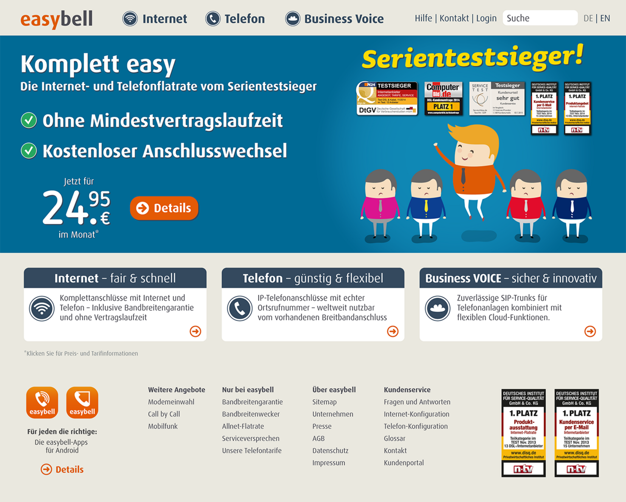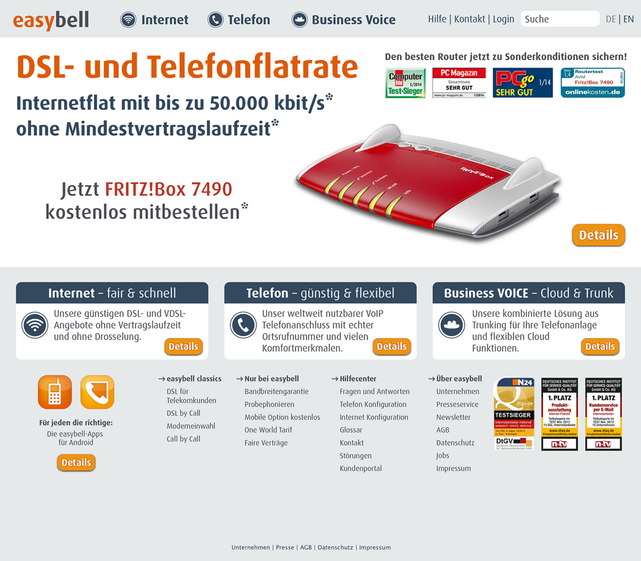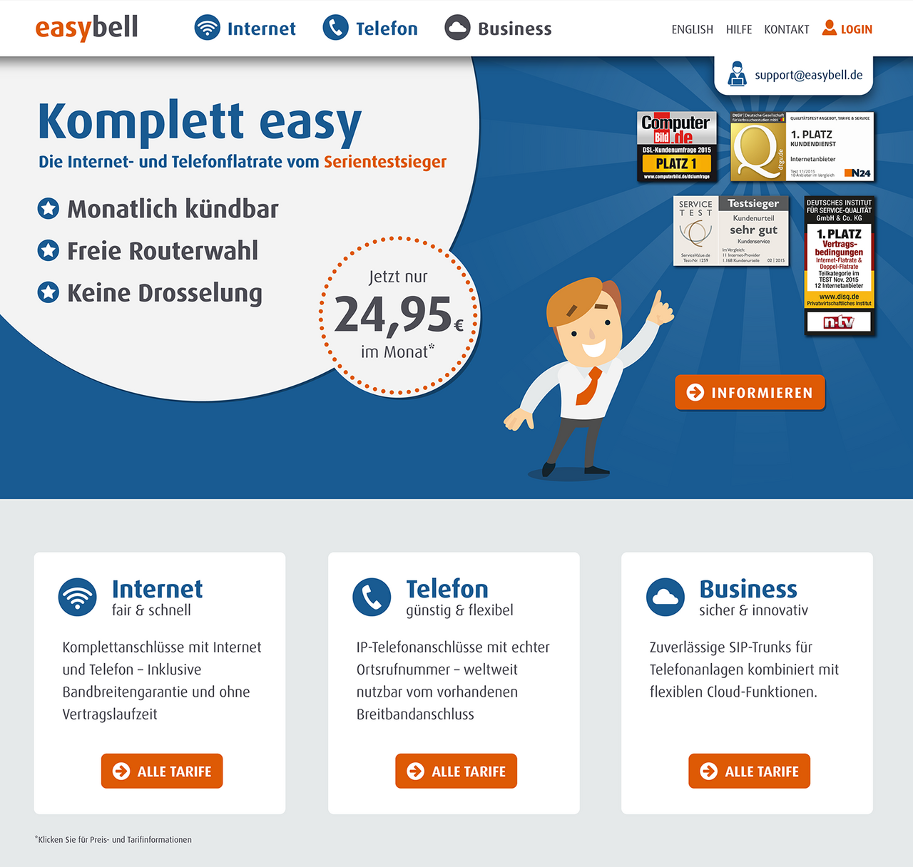 Zahlreiche Kooperationen und regelmäßige Empfehlungen in Tarifvergleichen zeigen: easybell ist noch immer Garant für Qualität und Service. Ganz weit vorn dabei: Unser beliebtester Tarif, der Komplett easy, die Internet- und Festnetz-Flatrate ohne Routerzwang und ohne Mindestvertragslaufzeit.