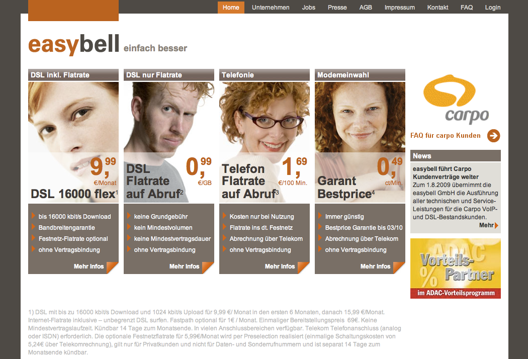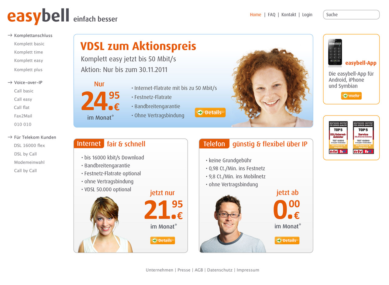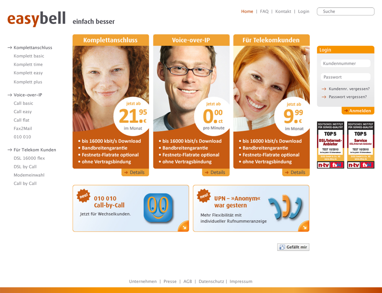 2011 nahm easybell VDSL in die Produktpalette auf. Ein Jahr später folgten die ersten SIP Trunk-Angebote für Businesskunden. Nach und nach passte sich auch die Website den neuen Anforderungen an.