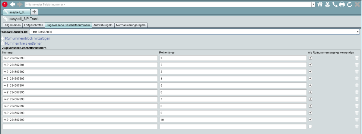 Um die Rufnummern zu konfigurieren, wechseln Sie in den Reiter „Zugewiesene Geschäftsnummern“. Bei einem Trunk kann über die Funktion „Rufnummernblock hinzufügen“ der gesamte Rufnummernblock angelegt werden.