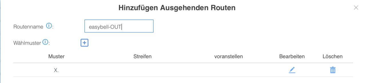 Das „X“ unter „Muster“ steht für die Ziffern 0 bis 9, und der Punkt für alles was danach folgt. Das bedeutet dass alle Rufnummern über diese Route gewählt werden können.