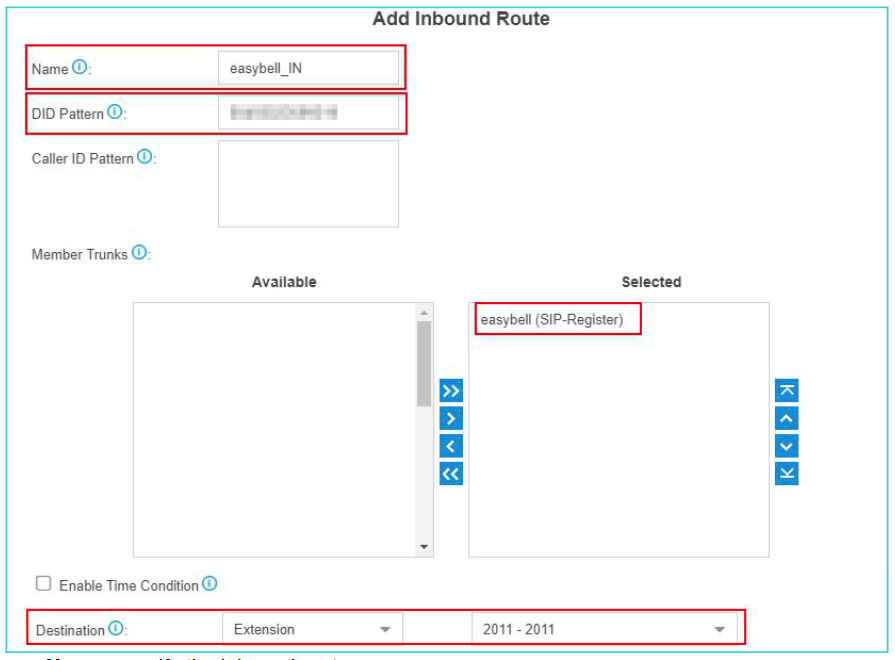 - Destination: Wählen Sie das Ziel, an das die eingehenden Anrufe weitergeleitet werden sollen.
