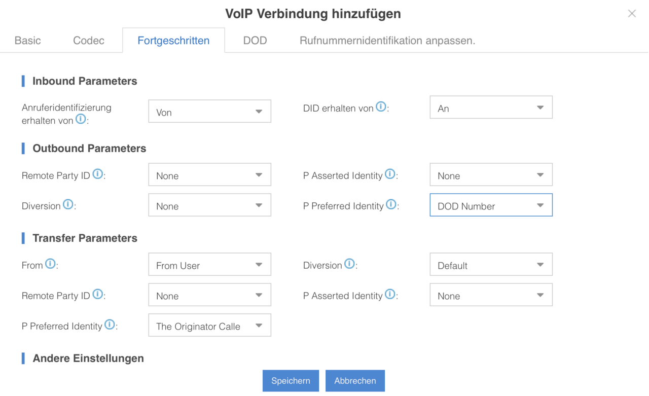 Im nächsten Bildschirm muss „Geräteabhängige Rufnummernanzeige (CLIP no screening)“ aktiviert und unter „Manuelle Feldauswahl“ der Punkt „P-Preferred-Identity“ ausgewählt sein.