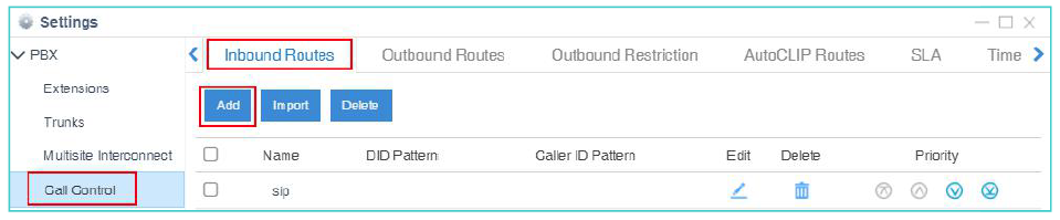 Gehen Sie hierfür in den Einstellungen unter „PBX“ zu „Anrufeinstellungen“ und „Inbound Routes“. Klicken Sie auf „Hinzufügen“.