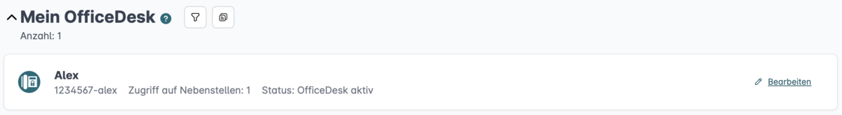 In der Übersicht der Cloud Telefonanlage scrollen Sie bitte zum Abschnitt „Mein OfficeDesk“. Dort klicken Sie neben Ihrem OfficeDesk auf „bearbeiten“.