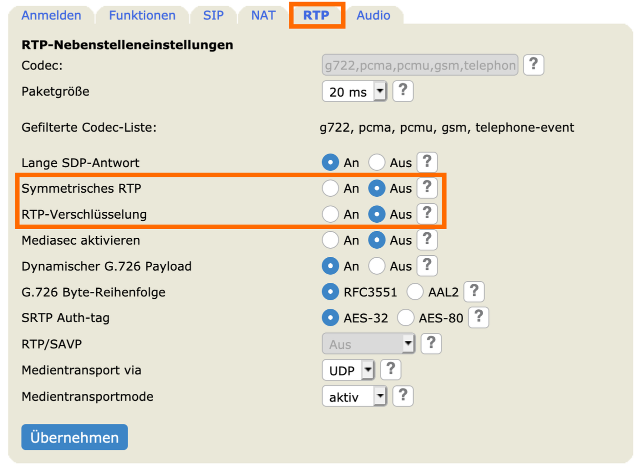 Im Reiter „RTP“ müssen Sie die Option RTP-Verschlüsselung deaktivieren.