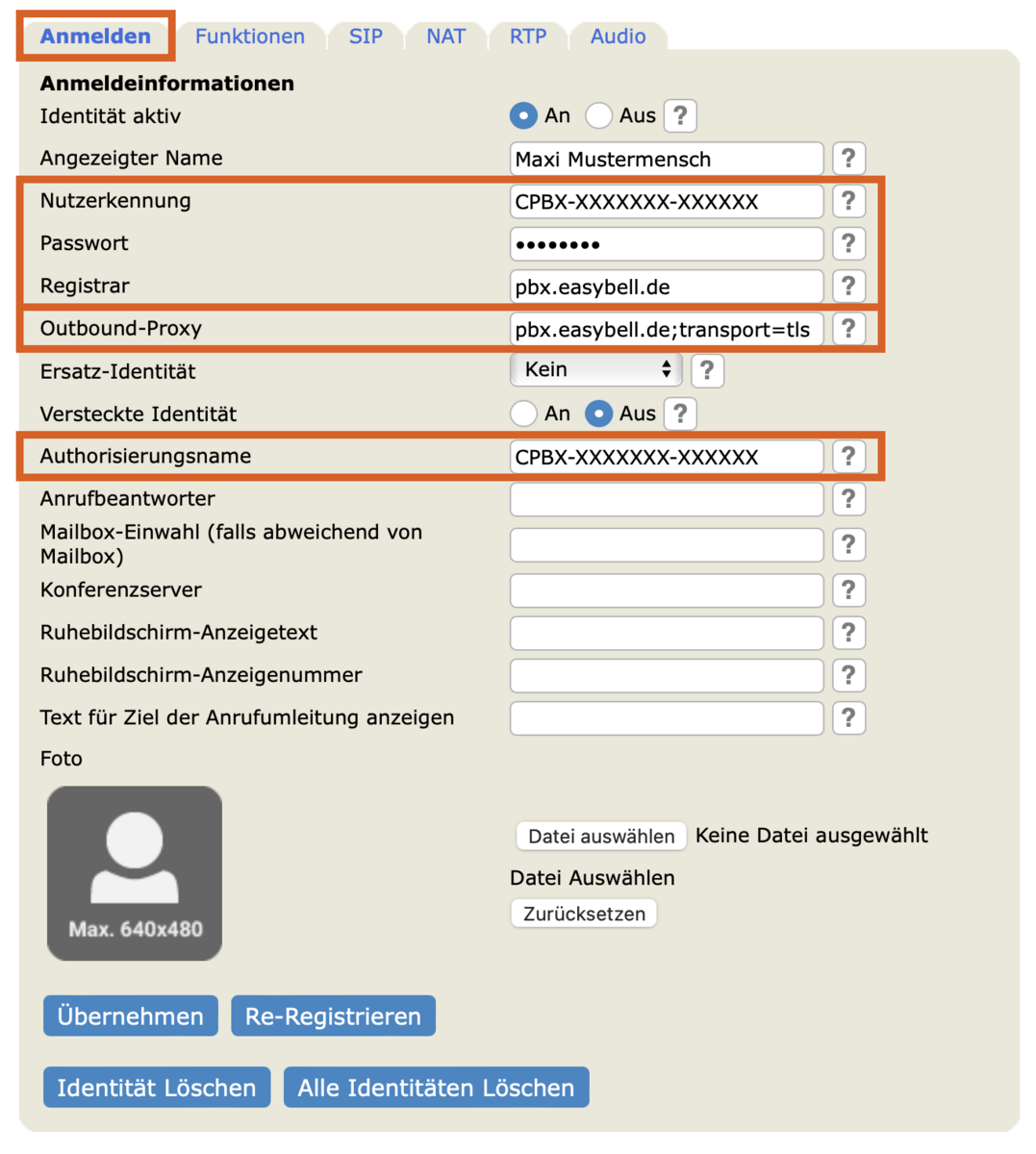 | Nutzerkennung & Authorisierungsname | Ihr SIP-Benutzername | Ihr SIP-Benutzername (Endgerätkennung) |