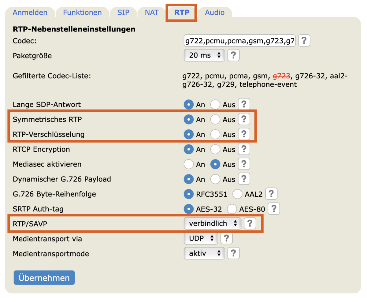 Im Reiter RTP müssen Sie die Optionen „RTP-Verschlüsselung“ und „Symmetrisches RTP“ aktivieren. Ausserdem muss der Punkt „SRTP Auth-tag“ auf „AES-80“ gesetzt werden.