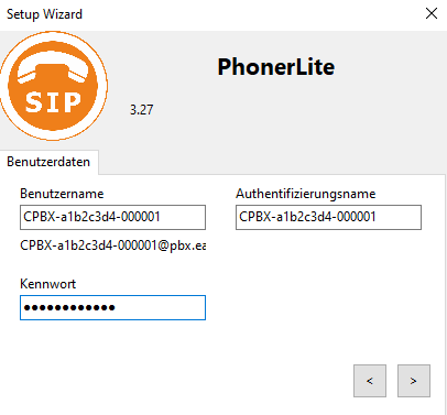 Tragen Sie in der nächsten Ansicht den Benutzernamen, Authentifizierungsname und das Kennwort ein. Benutzername und Authentifizierungsname sind immer identisch.
