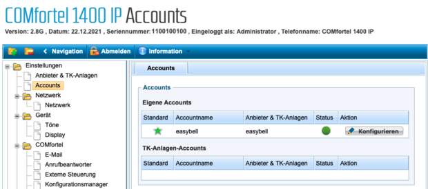 In der Übersicht der Verbindungen (Einstellungen → Anbieter & TK-Anlagen) sehen Sie nun, dass der Status der Rufnummer jetzt grün markiert und somit als registriert angezeigt wird.