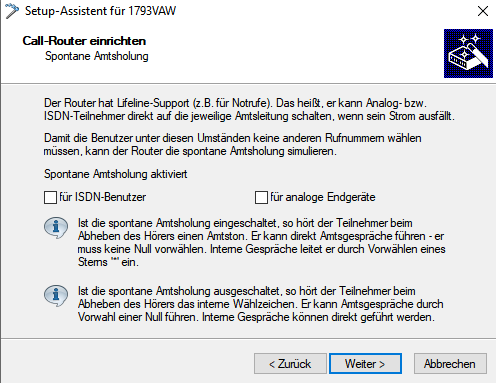 14. Die nächsten Seiten des Assistenten beziehen sich auf die Einrichtung der Call-Routen für die ein- und ausgehende Telefonie. Beachten Sie bitte, dass wir diese nach Abschluss des Assistenten in einem nächsten Schritt noch manuell anpassen.