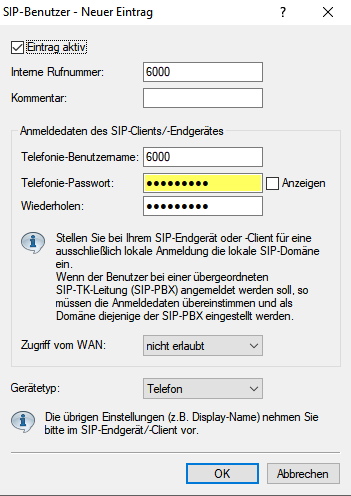 - Telefonie-Benutzername: Dies ist der Name bzw. die Nummer, unter welcher sich der SIP-Benutzer mit seinem Endgerät anmelden kann. Dies ist frei wählbar.