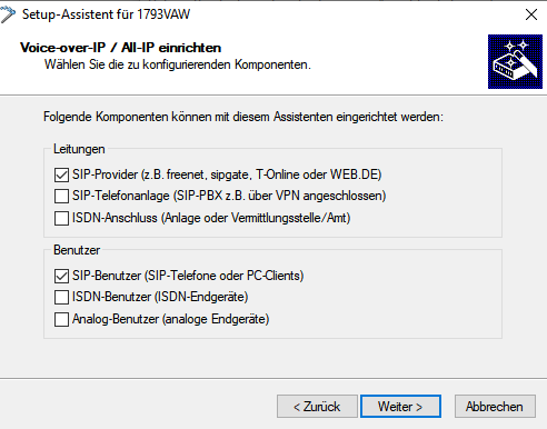 4. Dann gelangen Sie auf eine Seite, auf der die einzurichtenden Komponenten ausgewählt werden. Standardmäßig ist bei allen Punkten ein Haken gesetzt. Da wir in dieser Anleitung nur die Einrichtung von einem SIP-Provider und SIP-Telefonen durchführen, haben wir die anderen Punkte deaktiviert.