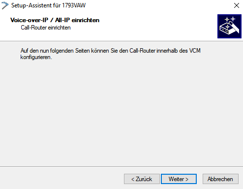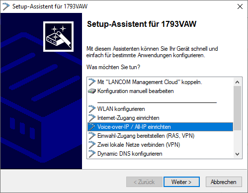 1. Wir verwenden für die ersten Schritte den Setup-Assistenten, welchen Sie durch einen Rechtsklick auf Router oder durch Drücken der Tasten „STRG“ und „W“ starten können. Dort wählen Sie zunächst „Voice-over-IP / All-IP einrichten“ aus und klicken auf „Weiter“.