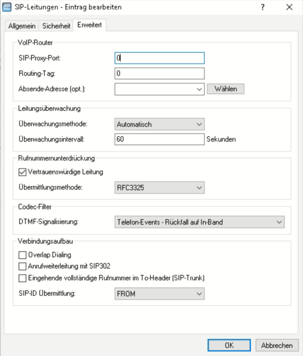 24. Anschließend wechseln Sie auf den Reiter „Erweitert“ und wählen dort unter „SIP-ID-Übermittelung“ den Punkt „FROM“ aus. Eine weitere Änderung in diesem Reiter ist nicht notwendig.