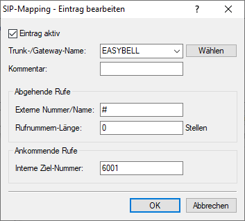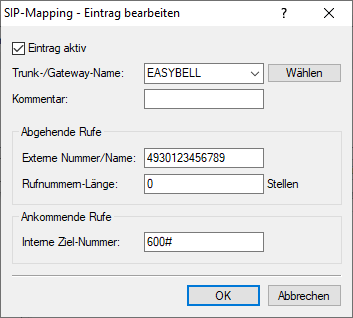 - Trunk-/Gateway-Name: Hier wählen Sie den vorhin angelegten SIP-Trunk aus. In unserem Fall ist dies „EASYBELL“.