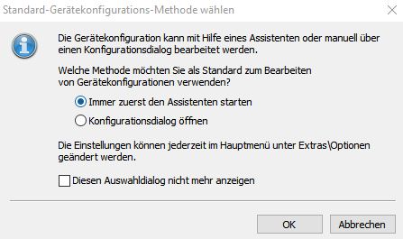 20. Sie sehen anschließend das folgende Fenster. Hier können Sie auswählen, ob beim Start der Software zukünftig erst der Assistent oder gleich die Konfigurationsübersicht angezeigt werden soll. Die Auswahl steht Ihnen frei.