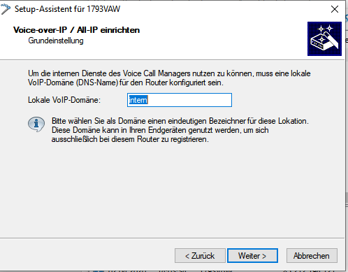 5. Nun werden die Grundeinstellungen vorgenommen. Auf der folgenden Seite können Sie eine „Lokale VoIP-Domäne“ vergeben, welche für die interne Registrierung genutzt werden kann. Der Name ist dabei beliebig, der Einfachheit halber haben wir hier die Standardeinstellung „intern“ belassen.