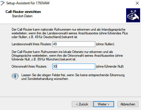 16. Auf der darauffolgenden Seite geben Sie jeweils Ihre Landesvorwahl und Ortsvorwahl ohne führende Nullen an. In diesem Beispiel ist die Landesvorwahl „49“ für Deutschland und die Ortsvorwahl „30“ für Berlin.