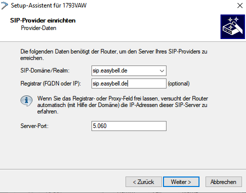 8. Auf der darauf folgenden Seite tragen Sie die SIP-Domäne sowie den SIP-Registrar ein. Beide Felder befüllen Sie dabei mit dem unten stehenden Reigistrar. Der Server-Port ist standardmäßig mit „5.060“ befüllt und muss nicht verändert werden.