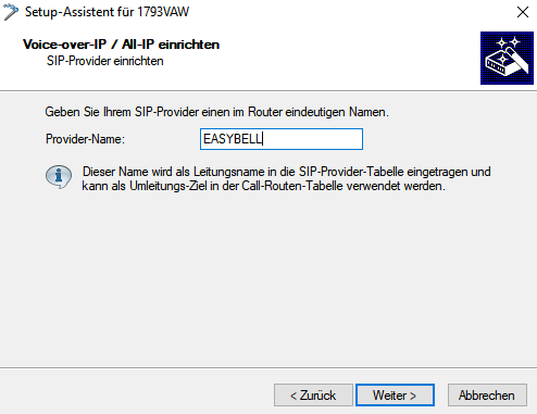 7. Die nächste Seite erfragt den Provider-Namen von Ihnen. Dieser ist ebenfalls frei wählbar. Wir haben diesen auf „EASYBELL“ gesetzt. Die Großschreibung wird dabei automatisch durch den LANCOM Setup-Assistenten gesetzt.