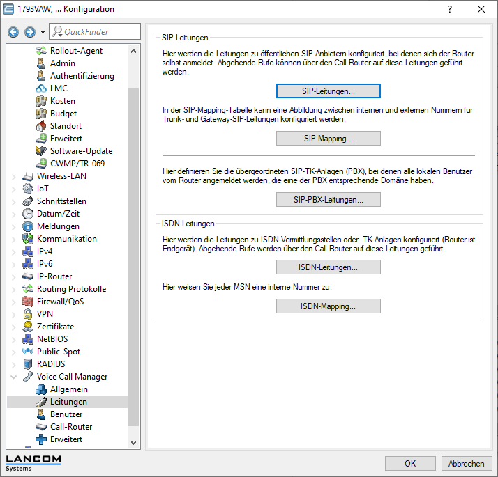 21. Nachdem sich das Konfigurationsfenster geöffnet hat, wählen Sie zunächst „Voice Call Manager“ und dort anschließend „Leitungen“ aus.