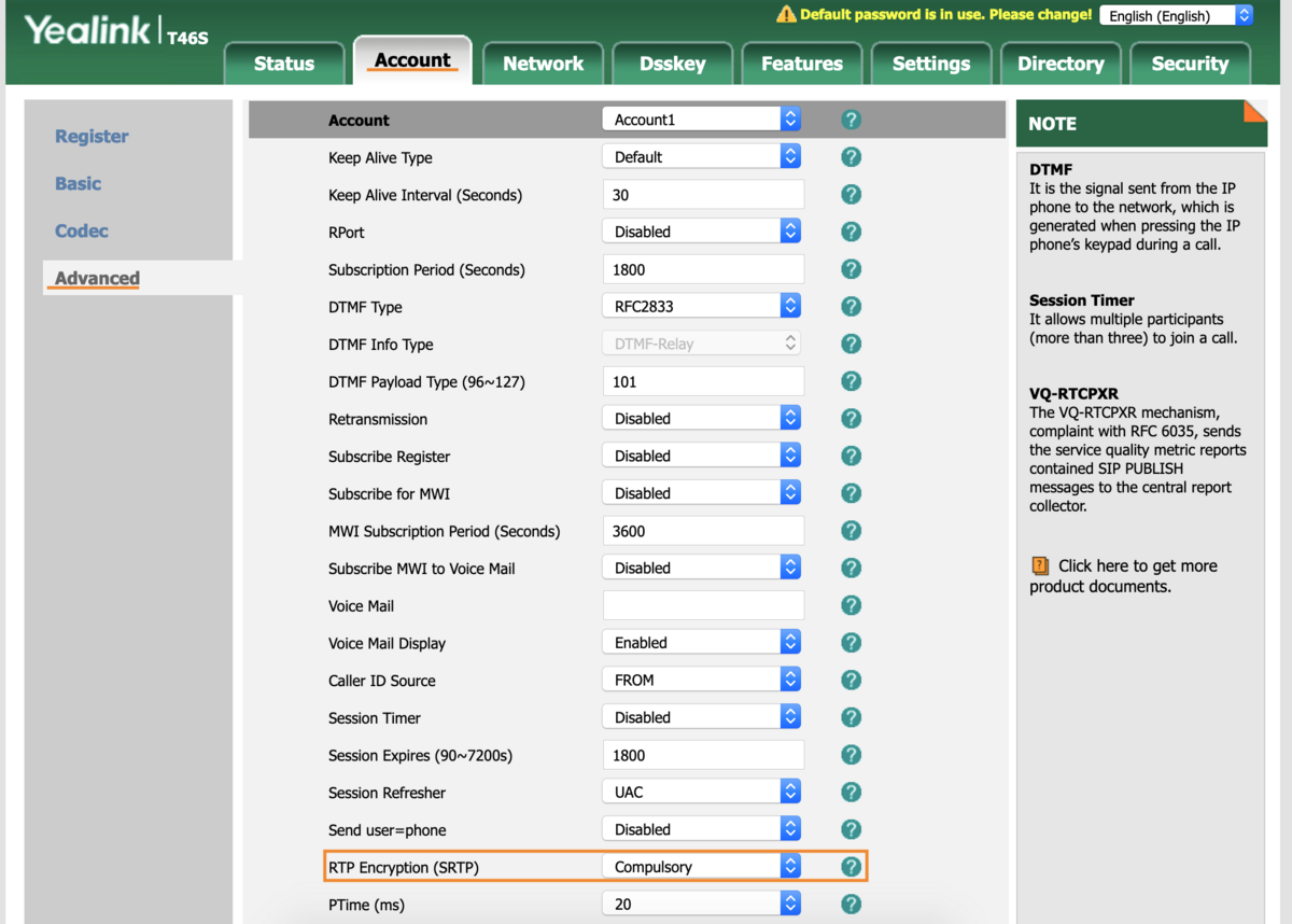 Nachdem Sie, wie oben unter Punkt 3 erklärt, die Priorität der Audiocodecs eingestellt haben, wechseln Sie nun bitte abschließend zum Reiter „Account > Advanced“ und setzen Sie die Option „RTP Encryption (SRTP)“ auf „Compulsory“.