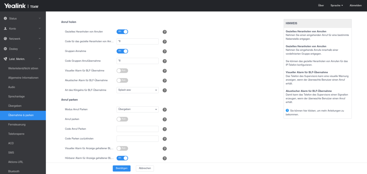 6.3. Einstellungen für die Übernahme von Telefonaten