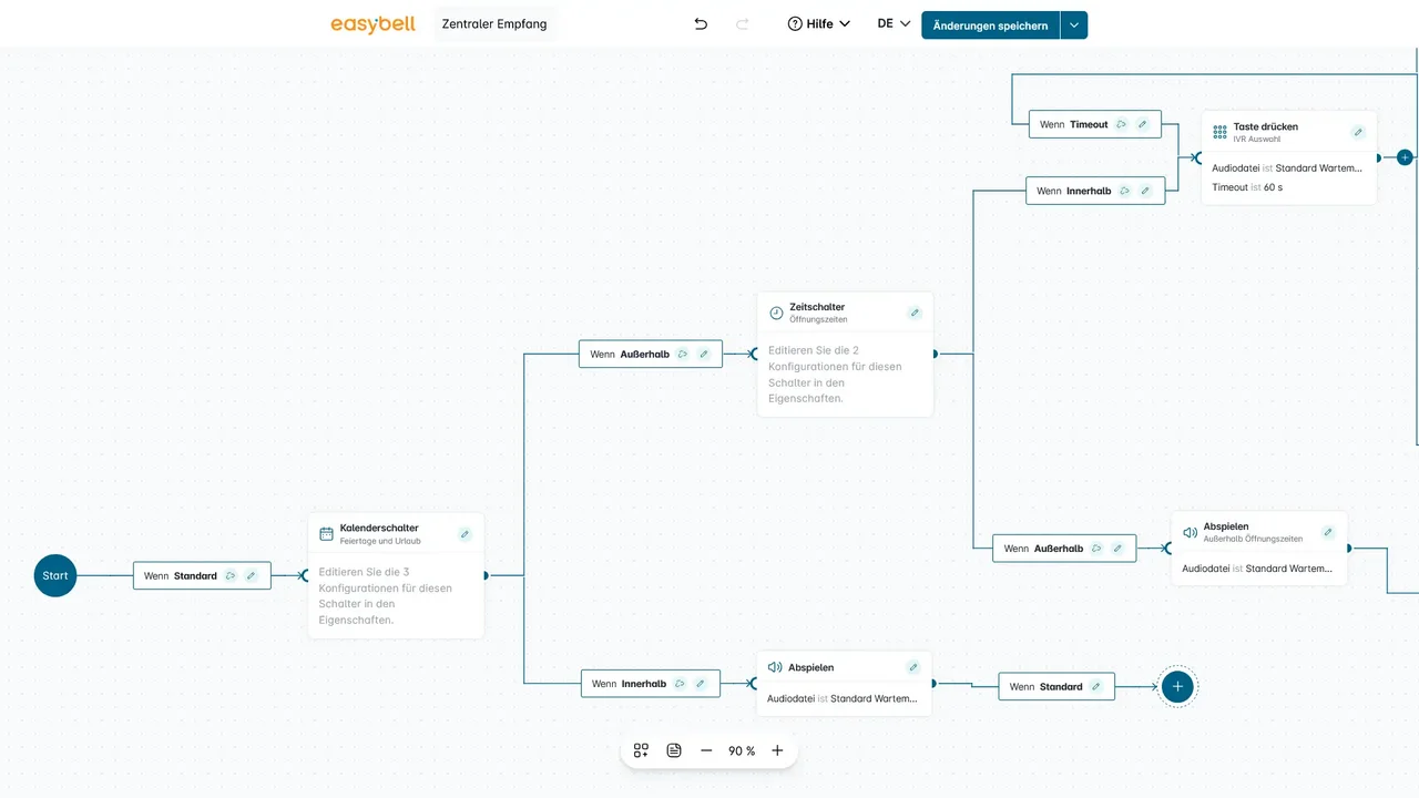Automatische Rufumleitungen und Ansagen basierend auf Öffnungszeiten (z. B. Mittagspause, Feierabend, Feiertage).