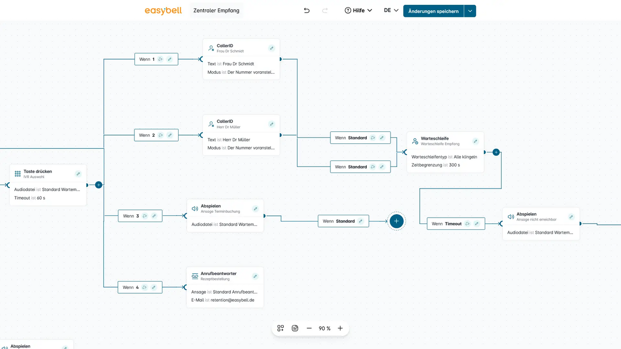 In unserem Webinar-Reihe Easybell Blueprints stellen wir eine typische Konfiguration für eine Gemeinschaftspraxis nach und zeigen, wie Ärztinnen und Ärzte mit Easybell Ihre Telefonie professionell nutzen können. Auf dieser Seite finden Sie die Einzelheiten des von uns erstellten Beispiels.